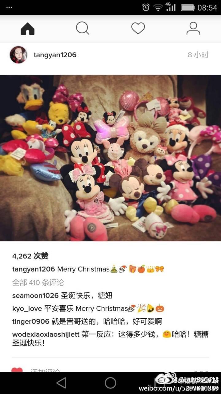 糖糖和拖把君圣诞节发糖,唐嫣ins上发的玩偶照片,是男朋友罗晋去香港的时候大包小包带回来的!