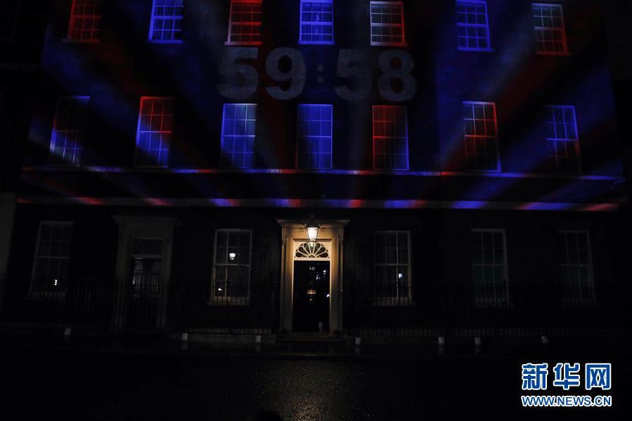 1月31日,在英国伦敦,倒计时的投影显示在唐宁街10号首相府的墙面上。 伦敦时间1月31日晚11时,英国正式“脱欧”,结束其47年的欧盟成员国身份。 新华社记者 韩岩 摄