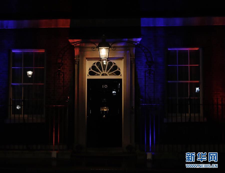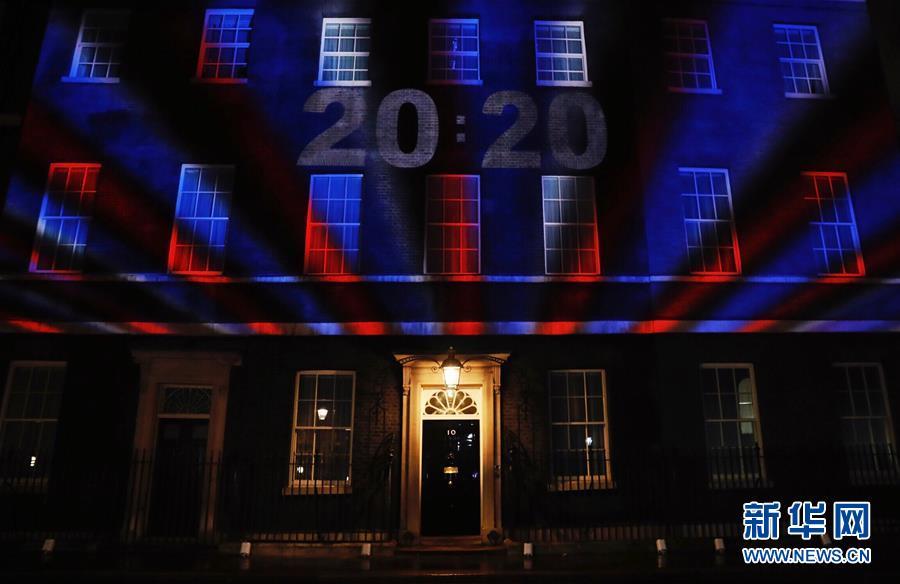 1月31日,在英国伦敦,英国国旗的颜色投射到唐宁街10号首相府的墙壁上。 伦敦时间1月31日晚11时,英国正式“脱欧”,结束其47年的欧盟成员国身份。 新华社记者 韩岩 摄