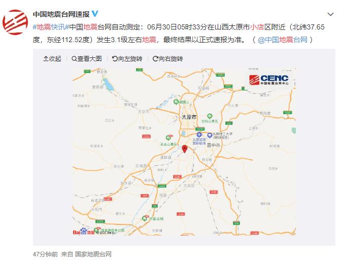 中国地震台网自动测定:06月30日05时33分在山西太原市小店区附近(北纬37.65度,东经112.52度)发生3.1级左右地震,最终结果以正式速报为准。