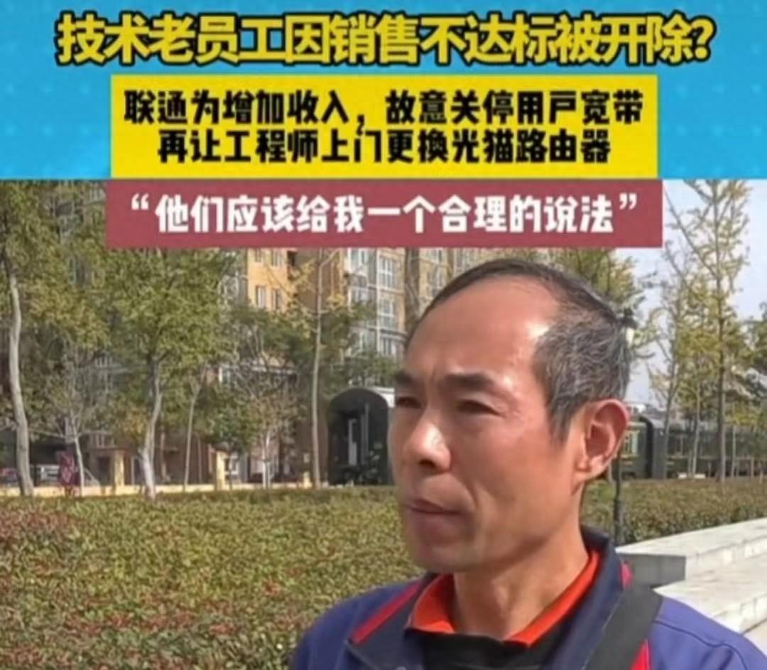 2023年11月16日,河南周口联通工程师祁师傅向媒体爆料:自己工作了十几年,因未完成公司下发的“每人每月完成10户终端更换”的推销任务,在没有提前通知的情况下,被公司无赔偿裁员,并且负责人嚣张喊话:他是劳务外包公司的人,没有赔偿,让他去劳动仲裁。