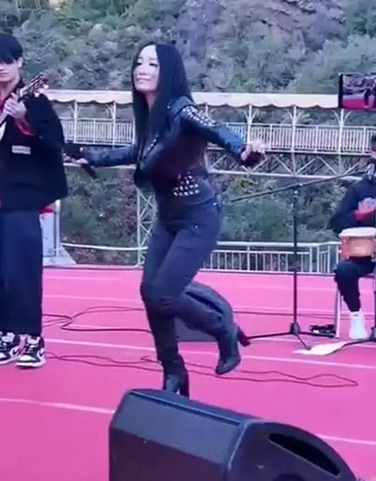 视频中的斯琴格日乐上身穿着酷酷的短款皮衣,下配黑色修身长裤,脚踩着一双黑色高跟皮鞋,不再是以前清爽的齐耳短发,而是一头乌黑的披肩长发,随着她欢快的动作飞舞着。