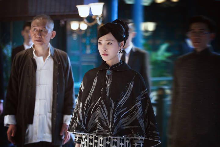 旗袍搭配斗篷披肩,美艳雍容,何杜鹃霸气十足,正符合她在剧中的身份,有着一份与众不同的气场,展露着娇媚的同时,更多的是透露着一份孤傲冷清,离世出尘的优雅,斗篷上的翻领设计,更是那个年代西式风尚的代表,领口一颗胸针点缀,典雅而华贵。