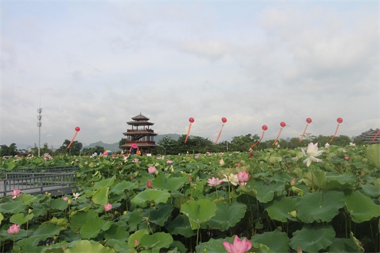 荷美覃塘景区位于贵港市覃塘区覃塘镇龙凤村和姚山村。贵港是中国荷城,覃塘是“莲藕之乡”。清代光绪版《贵县志》所录地方旧传八景,有“莲塘夜雨”之名,八景诗也有“银塘夜雨长荷英”的诗句。