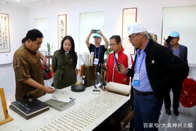 艺咖部落里,网络名人们依次参观姜红伟诗歌工作室、张万和摄影工作室、高俊川版画工作室、孙宝山书法工作室,观赏名家精品力作。同时,书法家孙宝山为“V眼看兴安网络名人兴安行”活动题字兴安行,印制帽子、衣服、笔记本等纪念品中,为活动增色添彩。