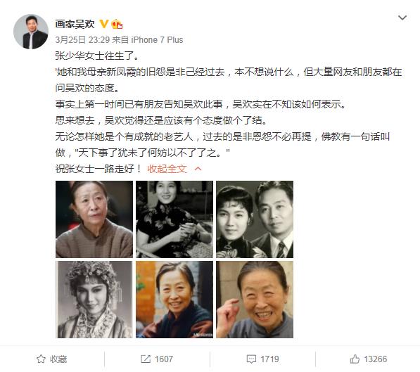 正当全网缅怀张少华的时候,画家吴欢突然发微博称,张少华与他母亲新凤霞的过往恩怨不必再提。