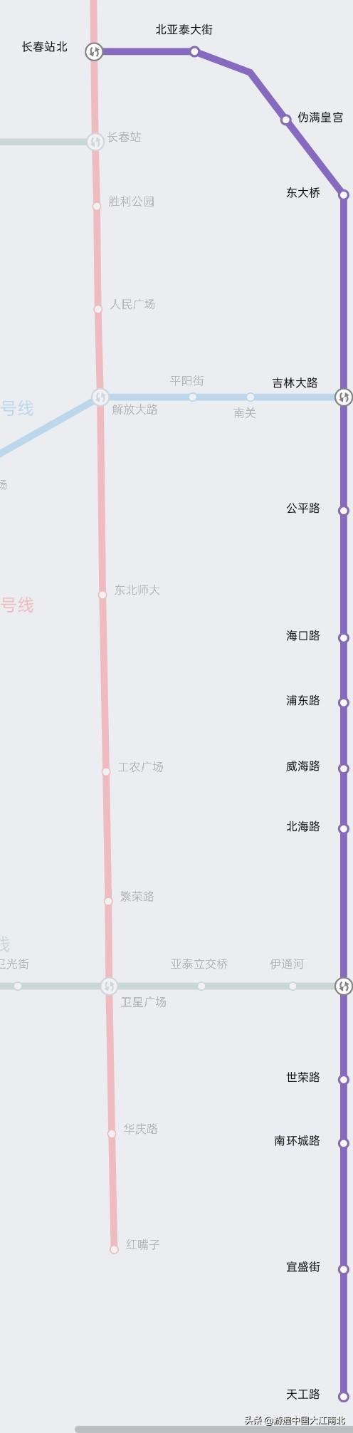长春轨道交通1号线,北起环城路站,止于红嘴子站,运营于长春市宽城区、朝阳区和南关区,途径人民广场、长春站、东北师范大学等地,呈南北走向[2]。