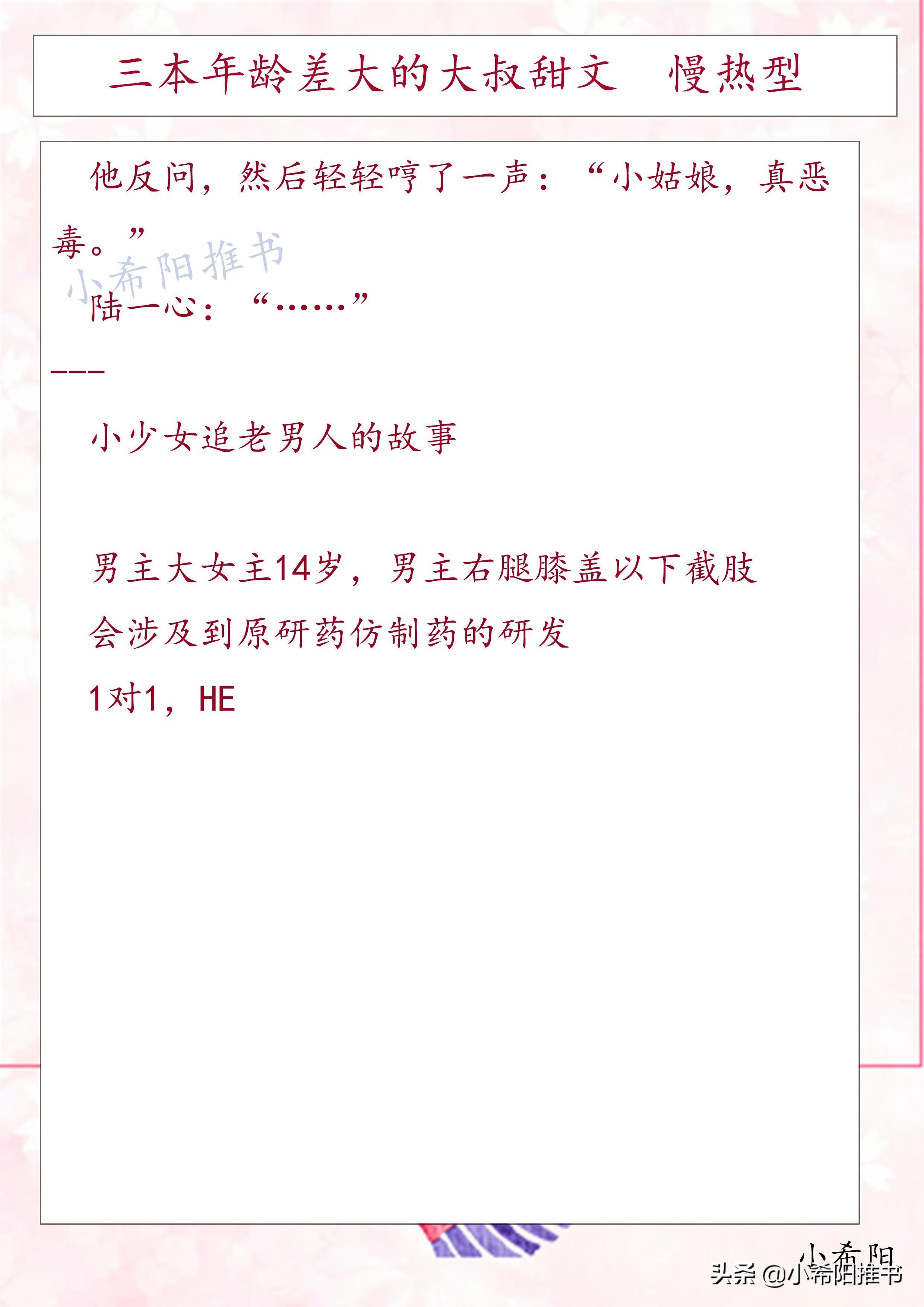 简要概括:这本属于救赎文,活泼古灵精怪的少女拯救截肢大叔。这本也很慢热,男主一直没有喜欢的人,男主前期一直把女主当作晚辈,很是关心照顾。男主很是自卑,不敢接受少女单纯热情的喜欢。
