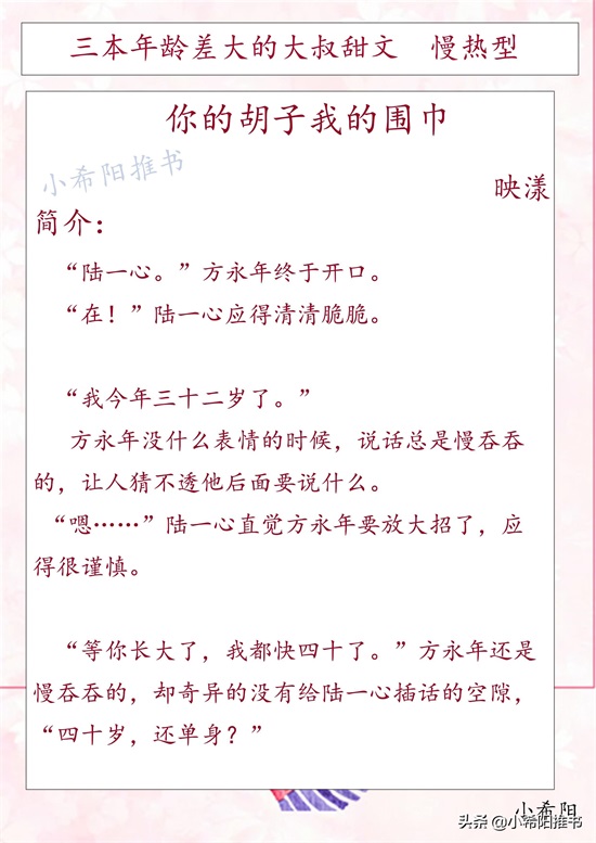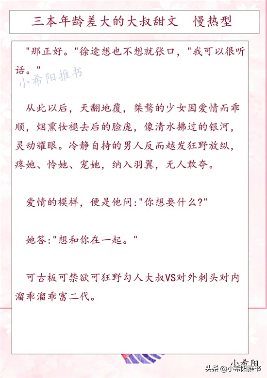 今天推荐三本年龄差大的大叔甜文,男主比女主年龄大很多,刚开始只是把女主当作小孩子,朋友要照顾的孩子。男主的内心都很矛盾,因为有年龄差,认为女主只是短暂的喜欢,不会长久,男主纠结矛盾的心理很细腻。