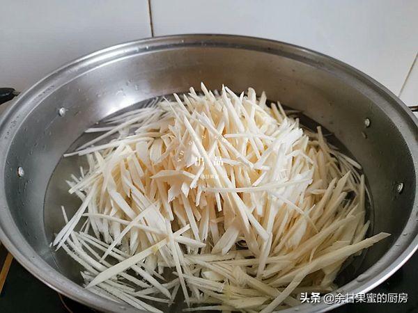 5、锅中烧开水,加入准备好高瓜丝焯水。加入食材后再次烧开,约煮上几秒钟,高瓜丝变软,捞出过冷水,沥去水分。