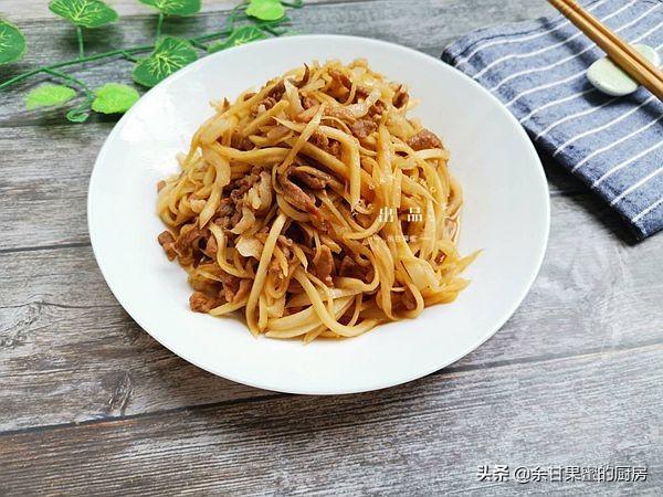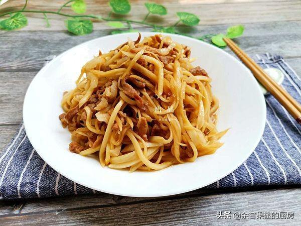 7、加入准备好的肉丝翻炒。肉丝要炒至熟透,也可以宽油入锅,过油后捞出,少量油炒制比过油要清淡一些吧。过油肉,一般是酒店大厨手法。