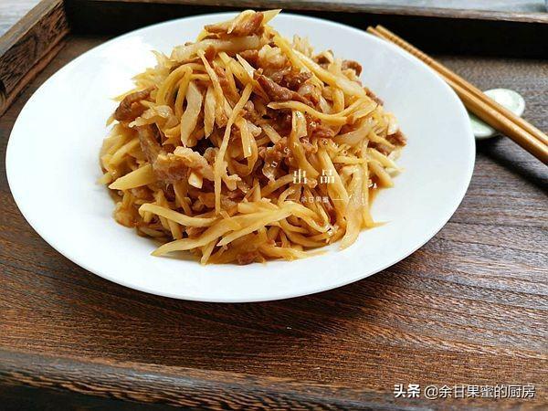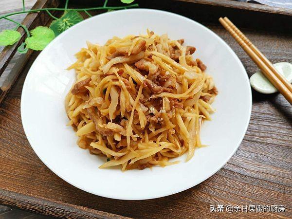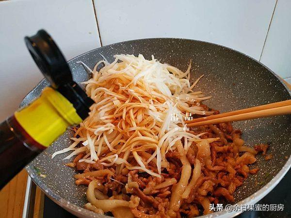 8、待肉丝炒熟之后,加入准备好的高瓜丝,加入适量味极鲜酱油,适量精盐,大约3-4克,酱油也有咸味,加盐要注意用量。