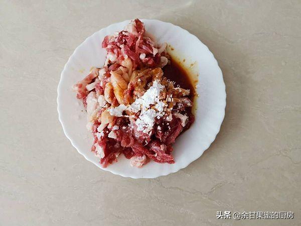 3、肉丝中加入少许食用油、淀粉、生抽拌匀,腌制一会,腌制入味,去腥,加点食用油肉丝不粘连,入锅后可快速均匀加热。