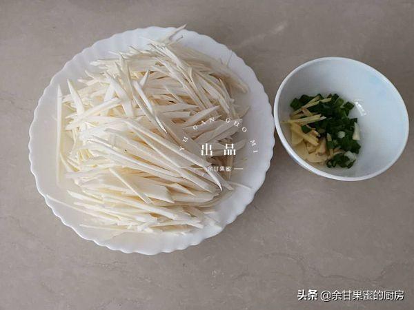 4、将高瓜切丝,先切薄片,然后切丝即可。准备一些姜丝、葱末、蒜片。或者红青椒丝。