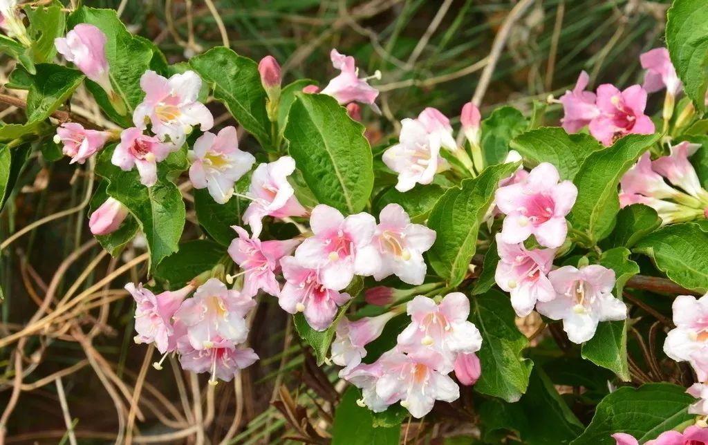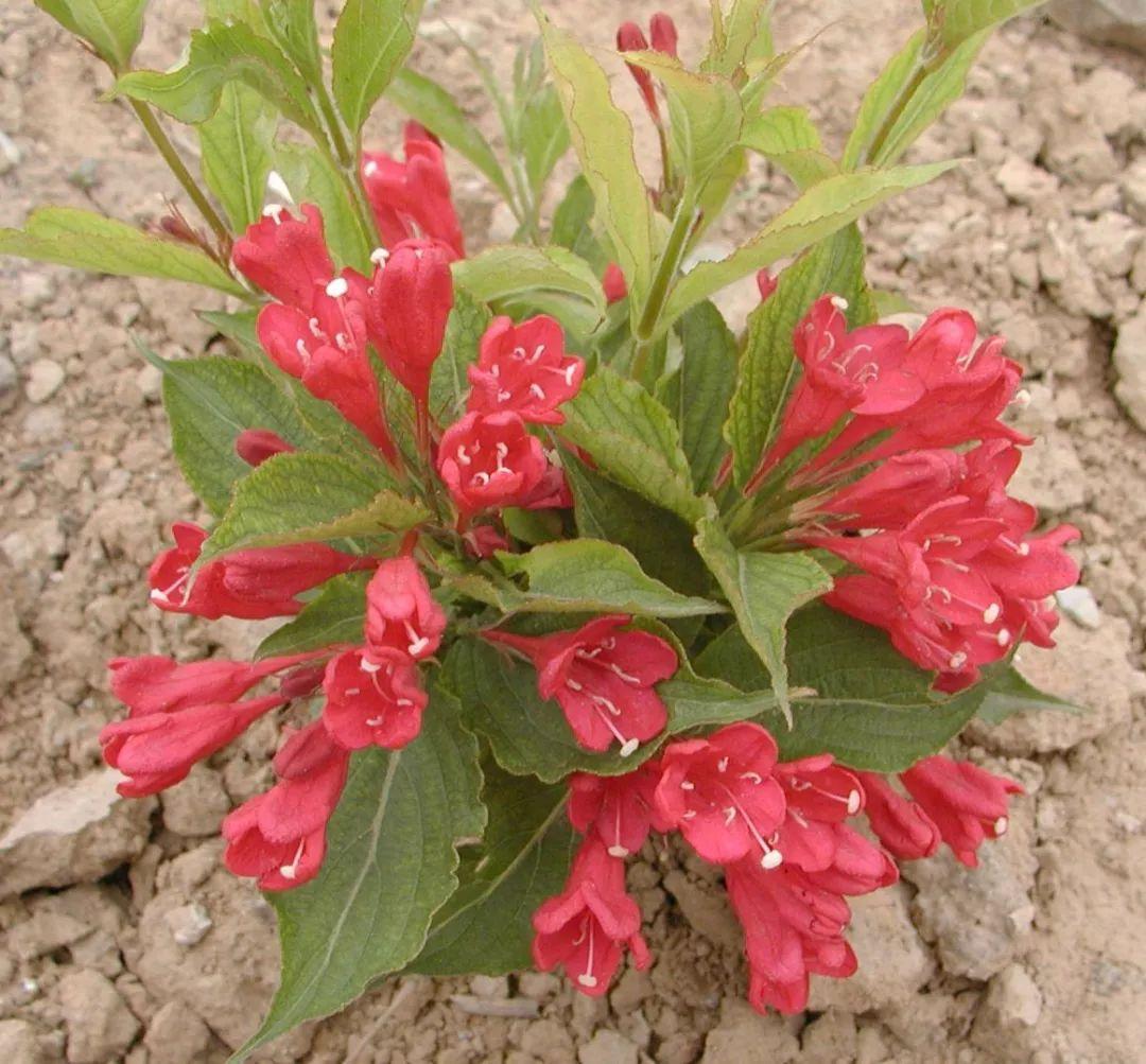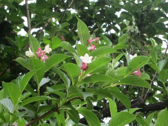 4锦带花属:锦带花属,落叶灌木;幼枝稍呈四方形。冬芽具数枚鳞片。叶对生,边缘有锯齿,具柄或几无柄,无托叶。花单生或由2-6花组成聚伞花序生于侧生短枝上部叶腋或枝顶;萼筒长圆柱形,萼檐5裂,裂片深达中部或基底;花冠白色、粉红色至深红色,钟状漏斗形,5裂,不整齐或近整齐,筒长于裂片;雄蕊5枚,着生于花冠筒中部,内藏,花药内向;子房上部一侧生1球形腺体,子房2室,含多数胚珠,花柱细长,柱头头状,常伸出花冠筒外。蒴果圆柱形,革质或木质,2瓣裂,中轴与花柱基部残留;种子小而多,无翅或有狭翅。