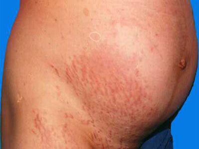 肚皮上及大腿根部尤为明显,症状与早发型相似。