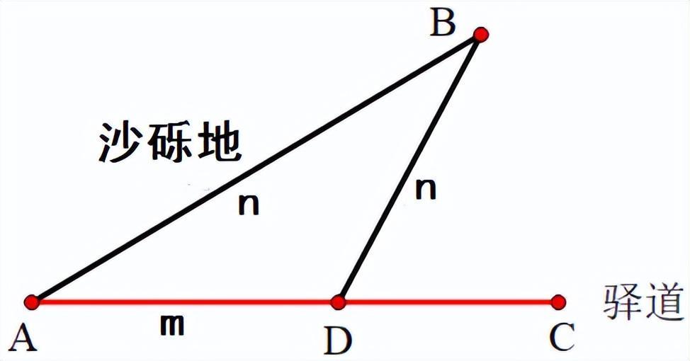 A是出发地,B是目的地,AC是驿道,AC上侧是沙地。为了急切的回家,小伙子选择了AB这条路。但是他忽视了沙地上行走速度慢的问题,即使AB的路程更短,但比走A-D-B路径所花的时间更长。怎么办呢?