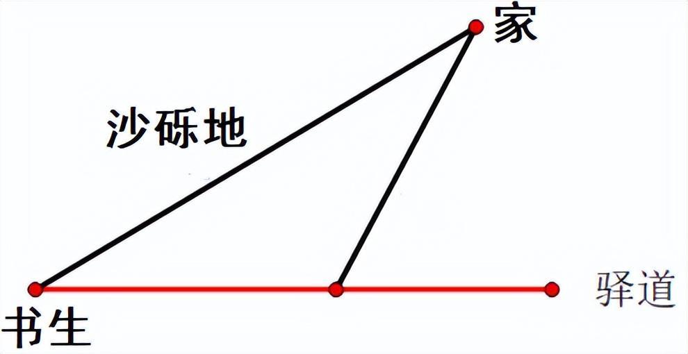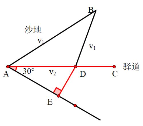 设驿道上的速度为m,沙地的速度为n,先假设,驿道上的速度是沙地上速度的2倍,即m=2n,怎样选择才能使行进的时间最短呢?