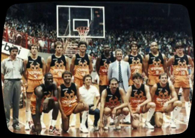 1985 年 8 月,Nike 在意大利举办了一场全明星表演赛,当时已经拥有 Nike 签名球鞋的 Michael Jordan 也受之邀请,此为背景。下图中左下1即为 Michael Jordan,注意它脚下的鞋,也注意他的球衣配色。