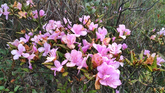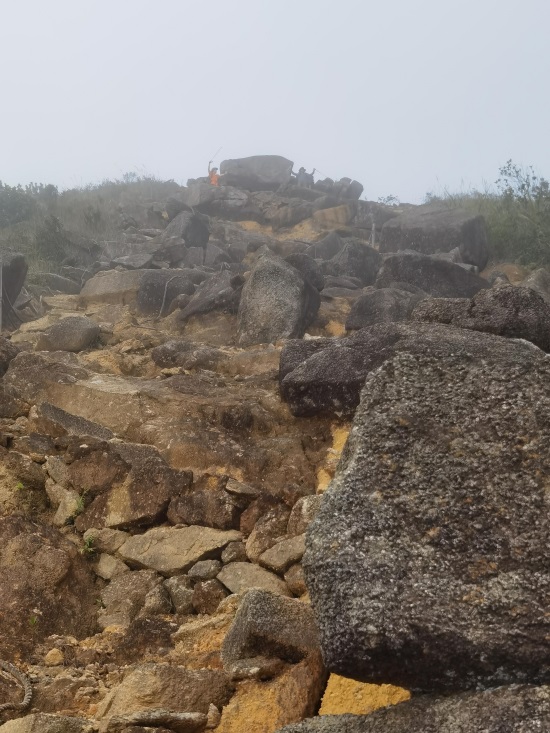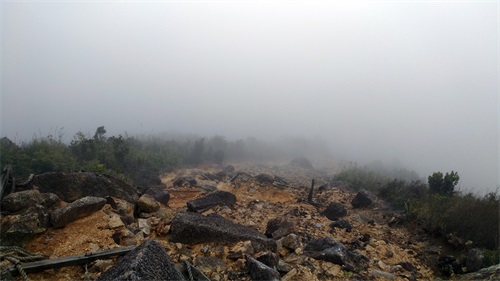 伙伴们垭口到齐后,继续向山顶进发,剩下约200米爬升。这一段因较陡和多乱石,以前两旁有木桩穿铁缆的护栏,但现已损毁,只剩下零星木头和断缆。途中云雾偶尔被风吹开,洒下一片阳光,以为云散天开了,但转瞬即逝,失望了好一会儿。