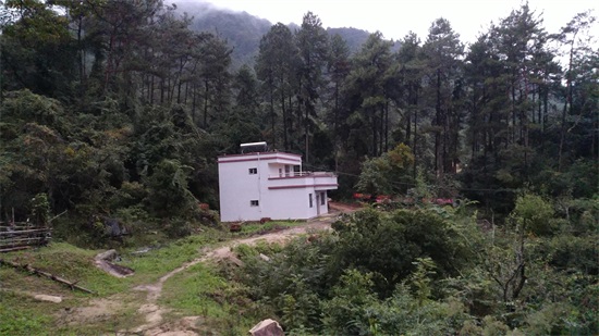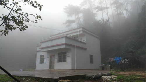 经过1小时爬升,我们到了一个叫“鸭仔田”的地方,此处海拔约568米。这里有一座二层楼房,是林场办公场所。大门紧锁没人办公,可看见防火标语和野生动物保护宣传画。此处还有从山上引来的山泉水,可以作为用餐、喝茶的休息地点。
