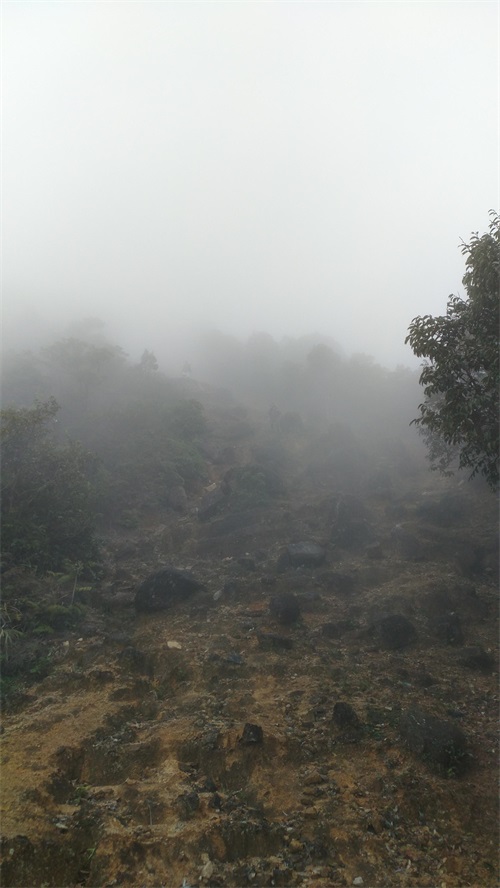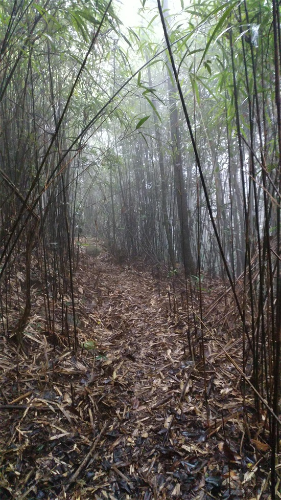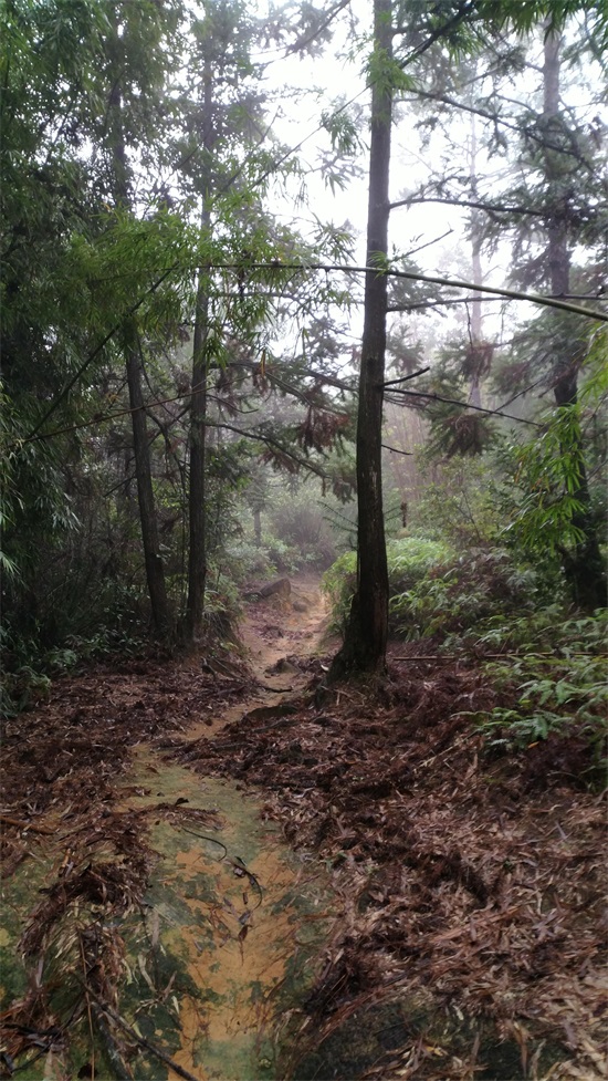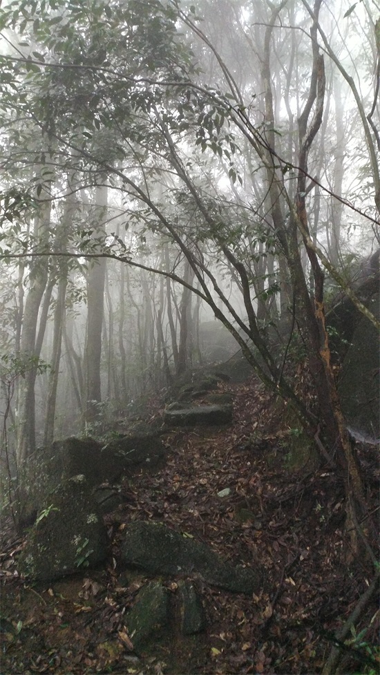 从楼房这里可选从左边或右边两条路攻顶,左边将有一段比较难爬,陡而且布满乱石的防火道。右边是一条林间小道,但要仔细认路以免迷失。我们休息十多分钟后选择从右边前进,将开始六百多米陡升。此时鉴于云雾弥漫,林间昏暗,大家约定15点前如果仍未到山脊就原路回撤。