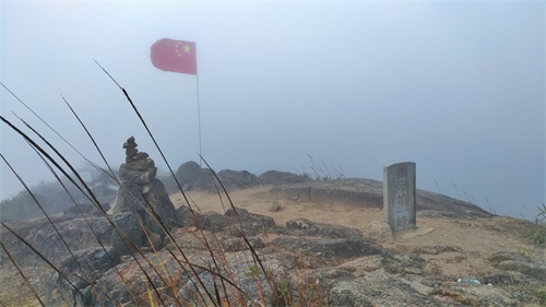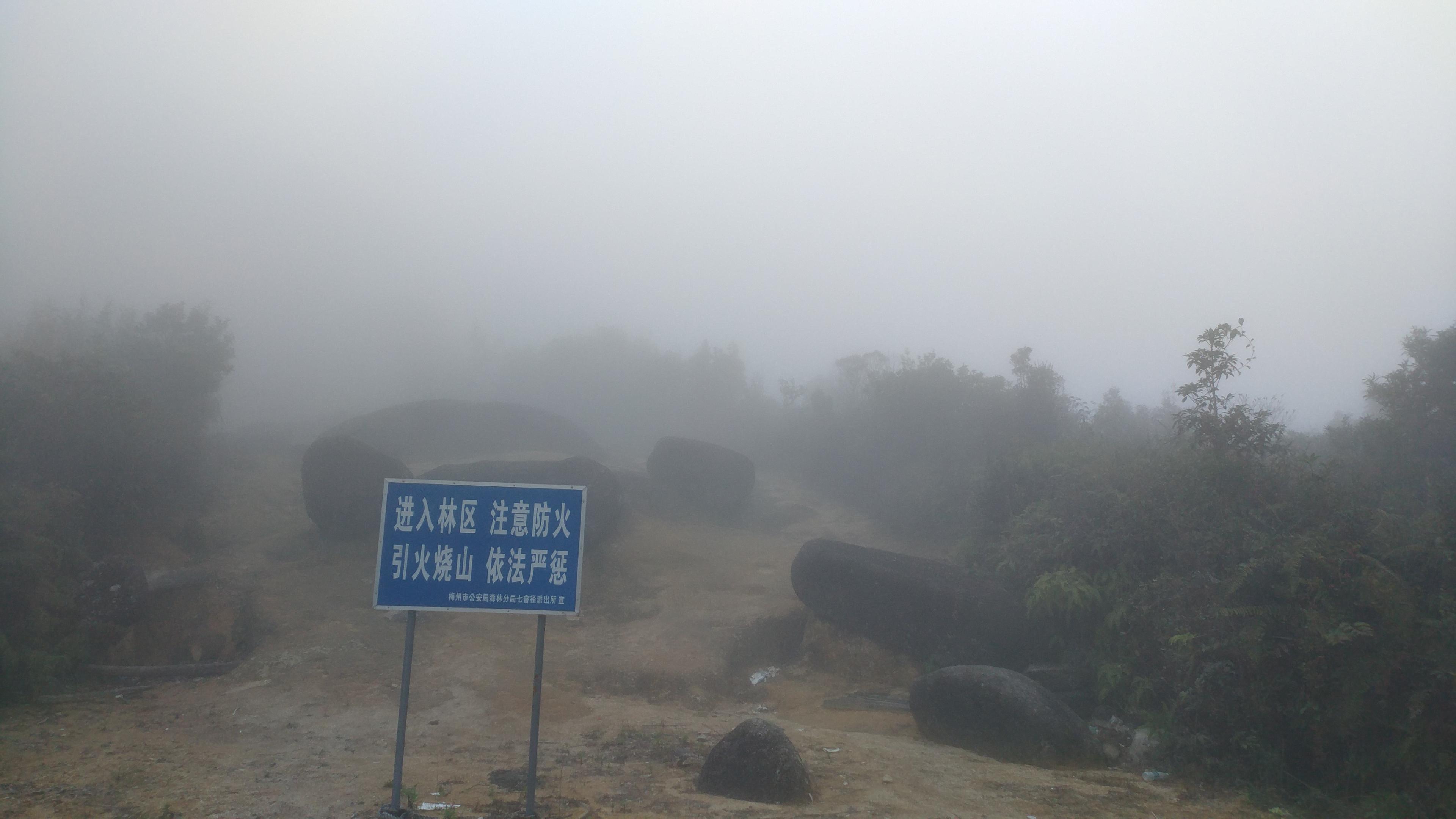 经过不懈地努力,我们终于登上了揭阳第一峰、五华第二峰的李望嶂。遗憾的是云雾依旧迷蒙,视野中似见一块块白板围挡,而且风大、寒冷。虽然躲在背风处换过了汗衣,但双手很快就被冻僵了。