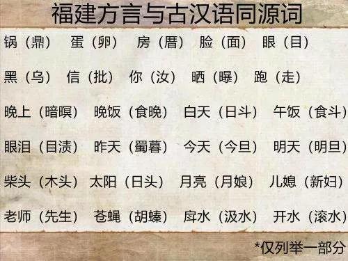 闽语的形态是很古老的,老得有时候你会觉得福建人说话简直就是在说古汉语:你叫汝,他叫伊,吃叫食,走叫行,脸叫面,黑叫乌,锅叫鼎,绳叫索,翅膀叫翼,图章叫印,房子叫厝,棉袄叫裘。当两个福建人相互询问“食糜未”(喝过粥没有)或“有伫无”(在不在家)时,你会不会觉得自己进了时间隧道?