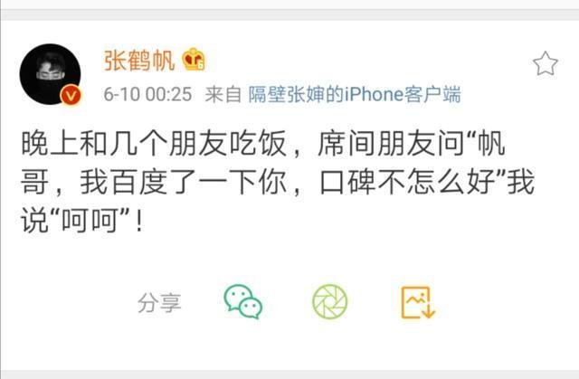 6月10号零点多,张鹤帆和几个朋友吃饭,他一个朋友问他,帆哥,我百度了一下你,口碑不怎么好,张鹤帆回复了两个字,呵呵。