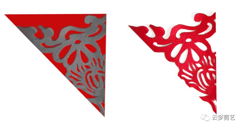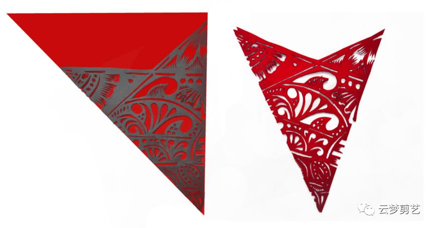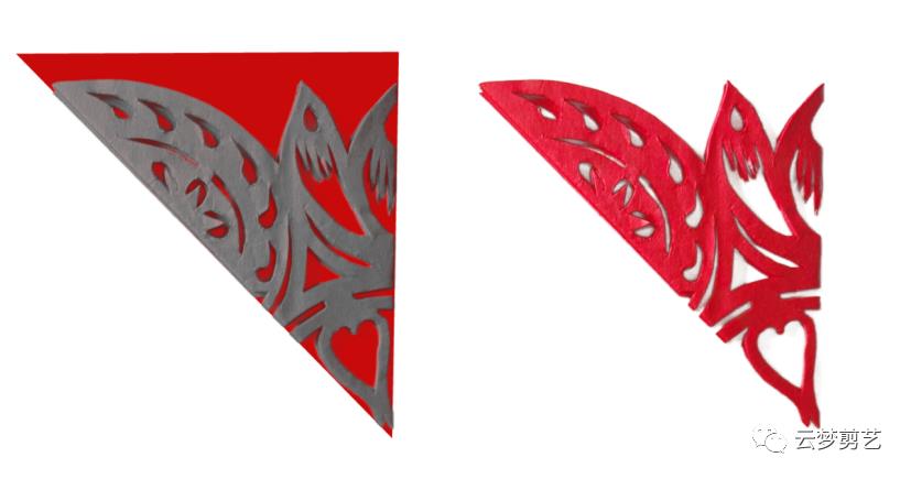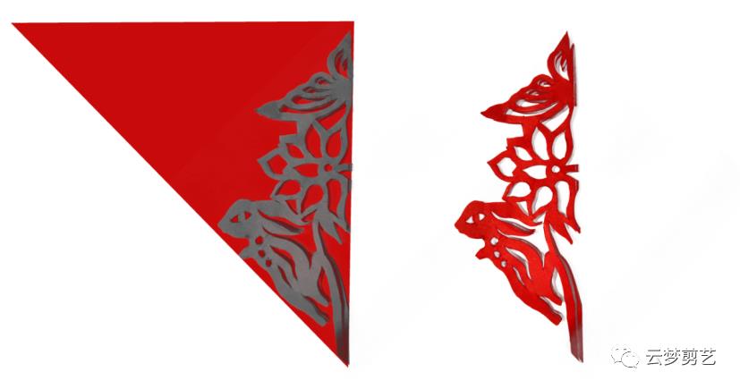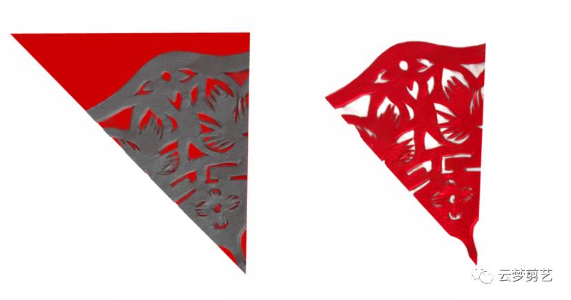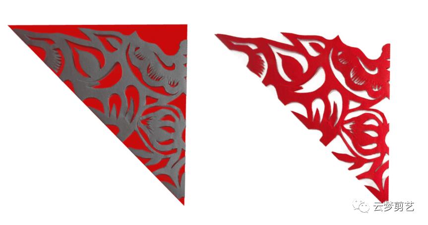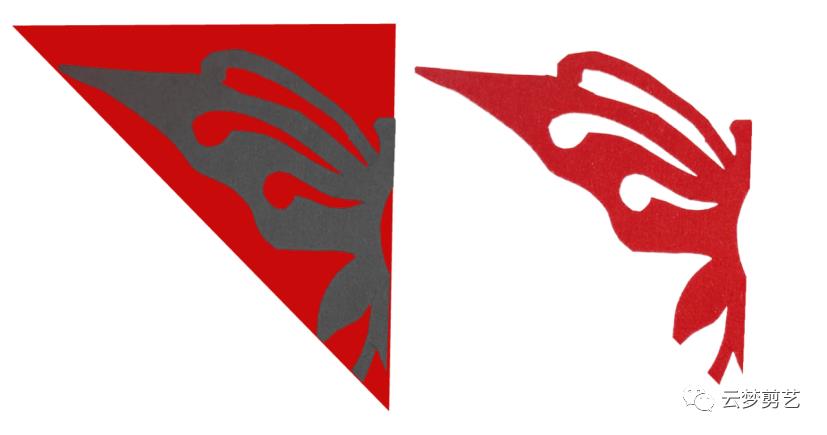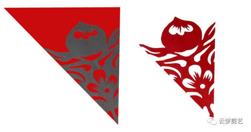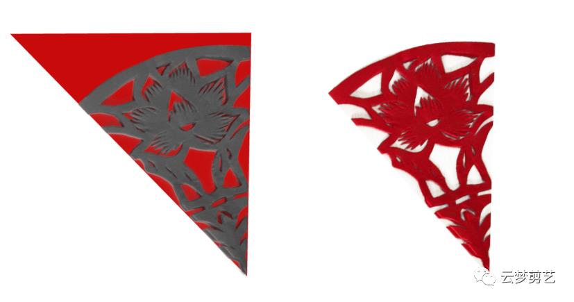 我们在折叠好的纸张上绘制出阴影部分的图案(保留灰色阴影部分,其他部分用剪刀剪掉,就得到了右边剪好的图案了)。注意一点,折叠好的纸张按照图示的位置方向摆放,注意中心点的位置。今天讲到的都是如此!