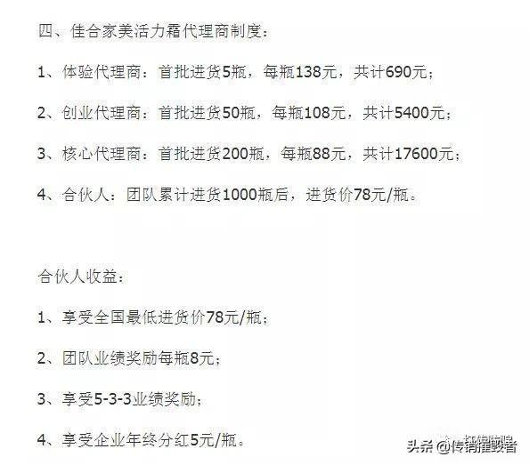 对合作伙伴(批发商)的晋升:在五个月内,直接晋升了5位核心代理商,其个人业绩达到2,000,您可以申请晋升合作伙伴。要求:成为合作伙伴后,每三个月将完成1000场演出作为评估标准。合作伙伴的好处:1)全国最低价为78元;团队购买价格为每奖励8元;享受533笔佣金;经营三级代理商;每股全球分红5元。