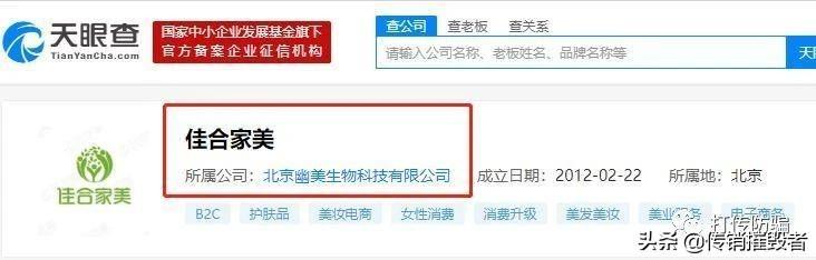 天眼查显示,佳合家美是北京幽美生物科技有限公司旗下一个医用护肤品品牌,主要为用户提供曖美人活力医用修复面膜以及佳合家美系列产品,包括活力霜、平衡霜、能量水等。佳合家美商标于2016年8月10日在中国商标局注册,并于2017年10月7日成功注册。商品服务包括:唇膏,美容面膜,成套化妆品、减肥用化妆品、化妆用油、洗澡用化妆品、化妆剂等。