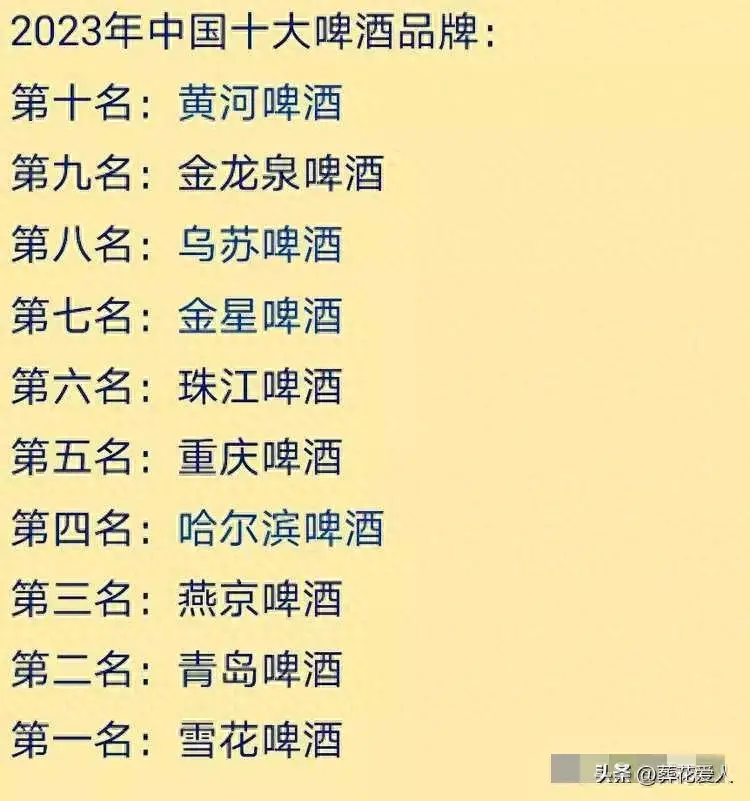 重庆啤酒是第五名,这个品牌在西南地区有着很高的市场占有率。重庆啤酒以其高质量和独特的酿造工艺而闻名,口感清爽,适合各种场合和口味。