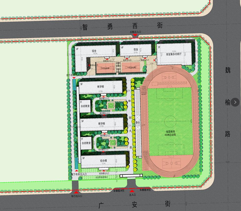 北京新学道晋中书院新校区位于魏榆路和广安街交汇处西北角,整体规划为两轴三区三院,南侧分为运动区、教学区与生活区,一条景观大道贯穿中间,规划建设8个单体建筑,总建面约6.26万平方米,投资1.75亿人民币,预计明年投用。