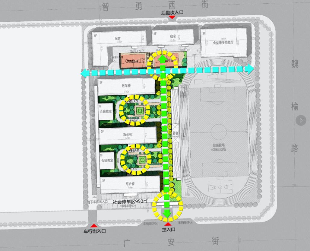 教学区位于西南角,远离魏榆路、广安街城市主干道,避免了噪音干扰,由2幢教学楼与1幢综合楼组成,可以满足小学6规制与中学6规制共1908名学生就学需求,中间围合而成了半开放式的景观庭院。