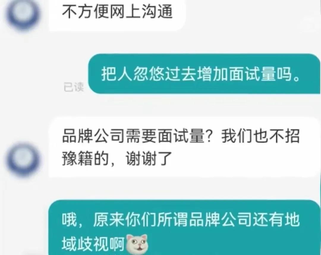 近日,一豫籍女子在上海求职,被对方告知不招豫籍的人。该女子把视频发出后,第二天该公司一名负责人表示,公司有很多河南籍员工,不存在地域歧视。可是聊天截图,明显写着不招豫籍。