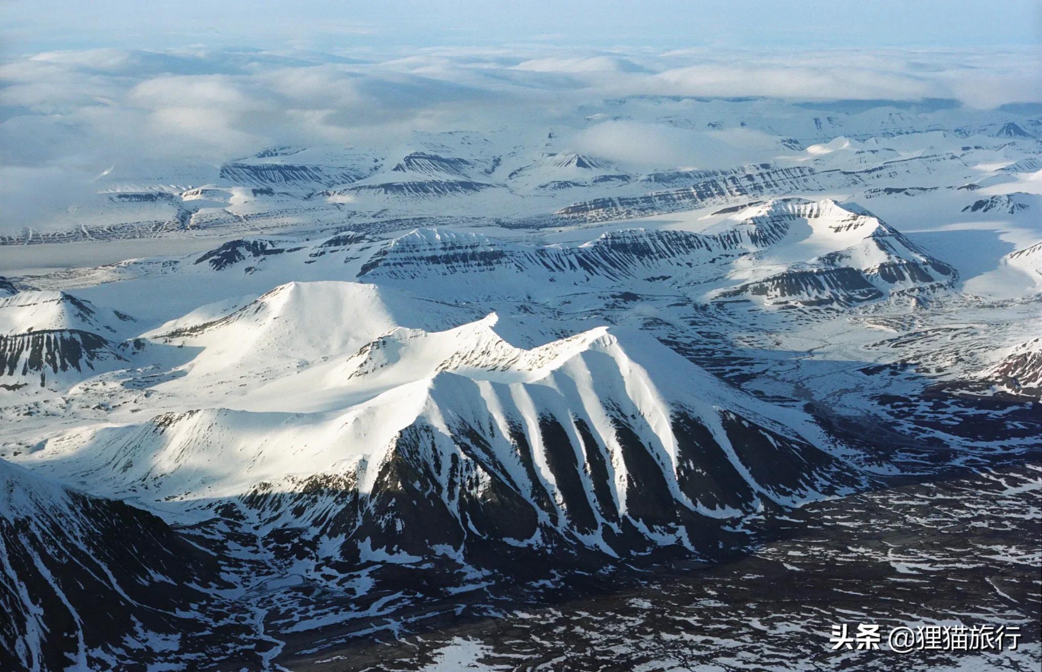 从空中俯瞰冰雪皑皑的斯瓦尔巴群岛