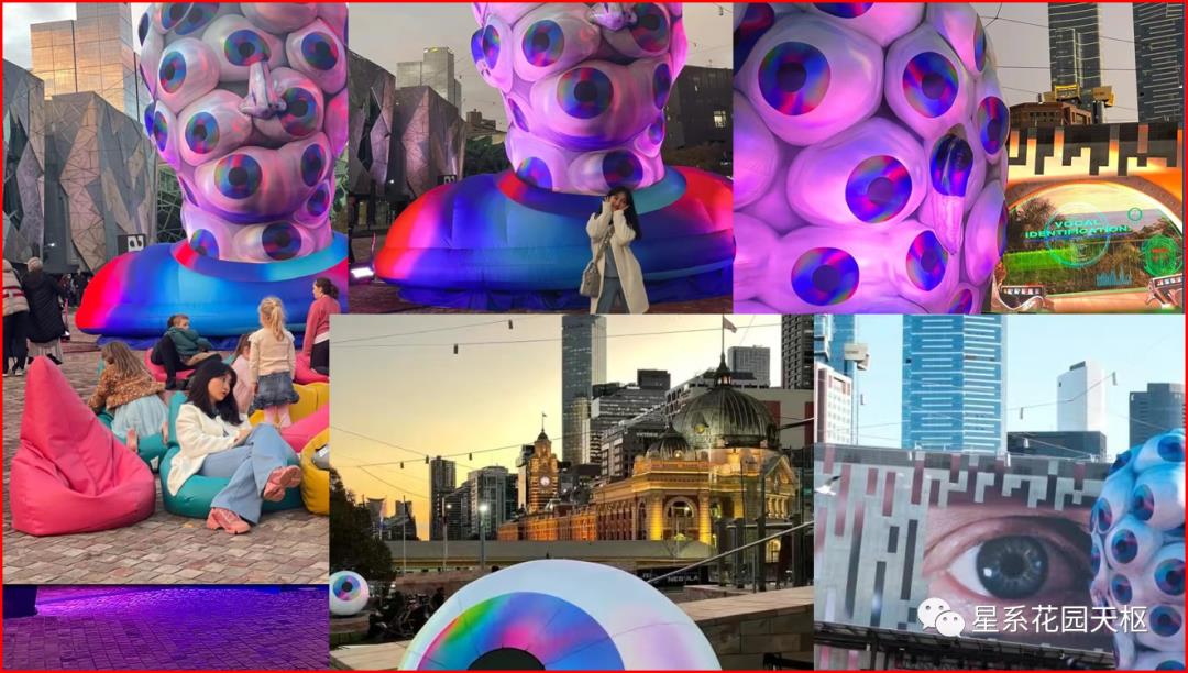 这是当时联邦广场决定设立的一个中央核心艺术装置。在之前,至少那些艺术品还有些许美感、或设计上的空间节奏感,然而,新一代的艺术真让人看了瘆得慌,不得不佩服“自由派”垄断的校园能培养出这般审美……该装置是为澳大利亚2022冬节目《除了广场以外的一切:都在监视下》做准备而搭建的,该节目是去年当地政府花重金筹办的一场文化盛典。