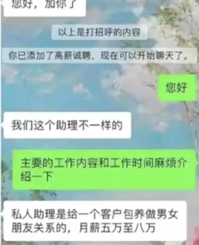 对方表示该岗位实质上是和客户做男女朋友关系,并需要陪客户睡觉,并直言“私人助理是给一个客户包养做男女朋友关系的,月薪五万至八万”。该网友称随后报警,事件曝光后即引发网友关注。