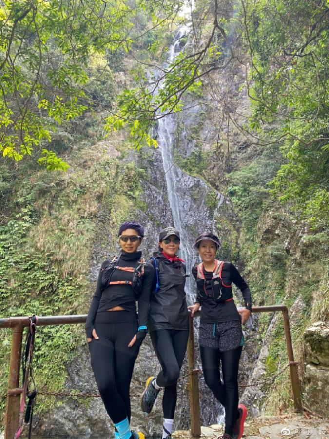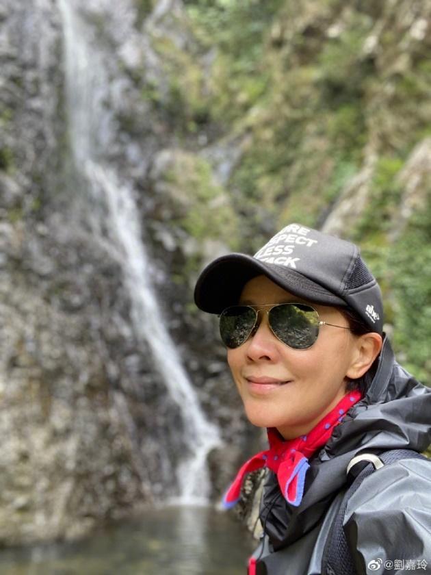 54岁刘嘉玲和好友登山,瀑布前秀大长腿,素颜出镜朴素大方