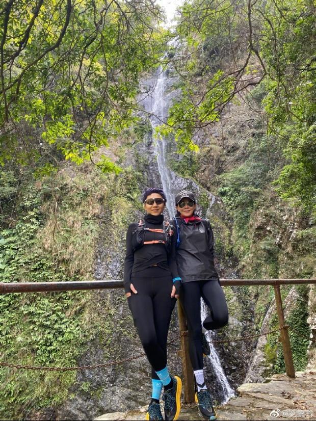 刘嘉玲还和自己的朋友合影,两人站在瀑布前,形成靓丽的风景线。刘嘉玲穿着黑色的运动外套,同色的紧身裤,白色的袜子压住裤边,配上黑色的运动鞋,一双大长腿格外的显眼。