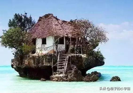 东非桑给巴尔的东海岸,开在悬崖上的餐厅,需要根据潮水的涨退才能选择步行或乘船到达餐厅。