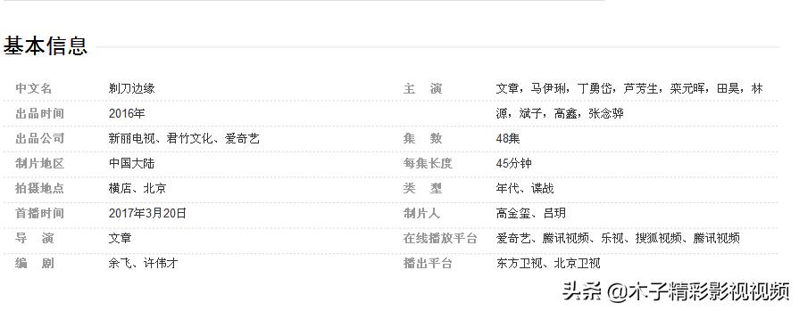 《剃刀边缘》是由文章执导,文章、马伊琍领衔主演的年代谍战剧 。