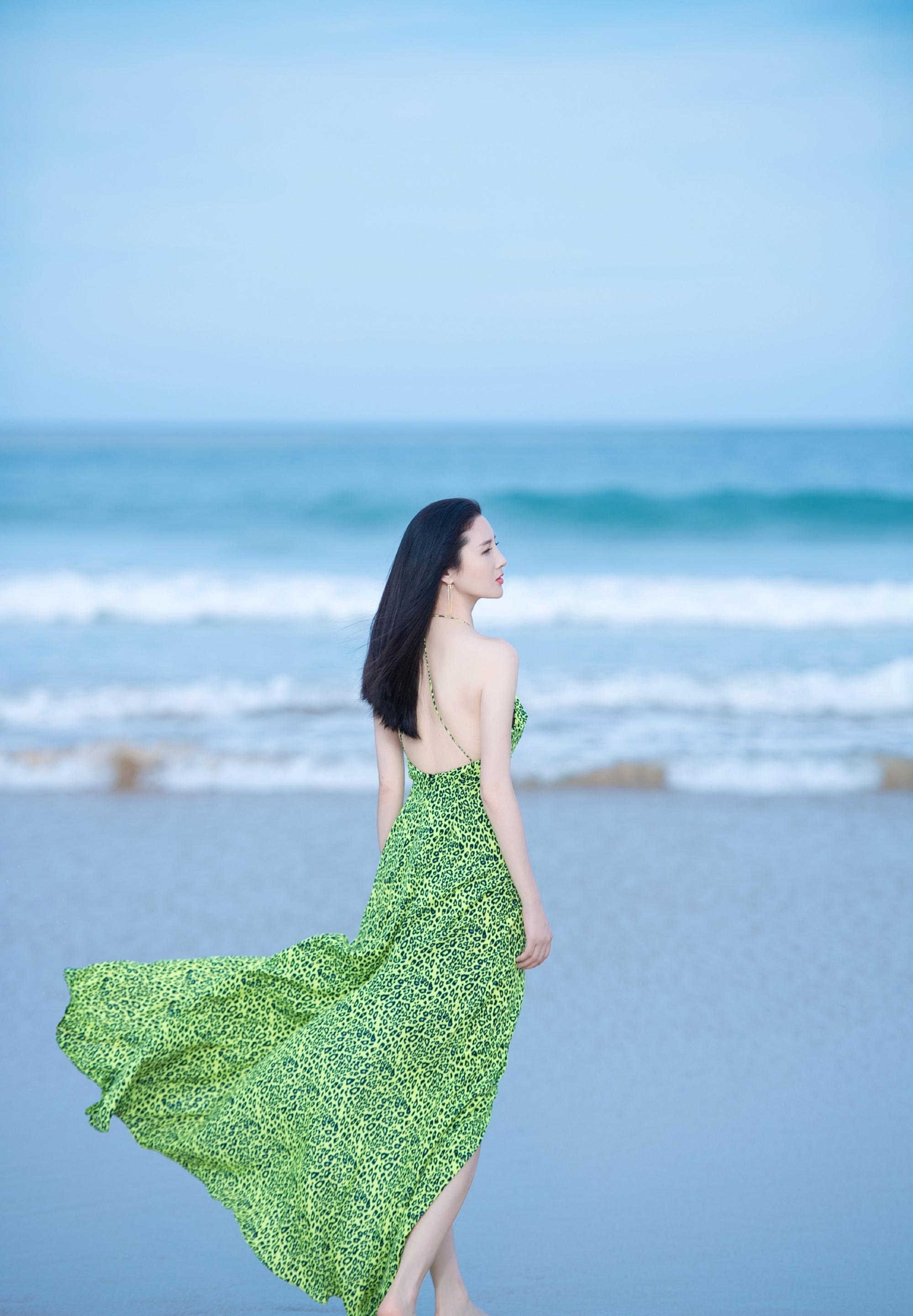 我们看到章佳怡发的这组写真中,她身穿绿色碎花吊颈深V露肩和露背长裙,前襟露事业线。她耳朵戴着金色长圈耳环,唇红齿白。她拥有1米75的身材,苗条高挑,肌肤如白雪,估计在阳光下晒1天都不会黑。章佳怡在海滩漫步,微风吹乱了头发,也吹起了长裙,露出美白长腿。