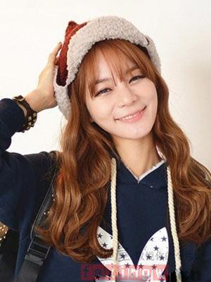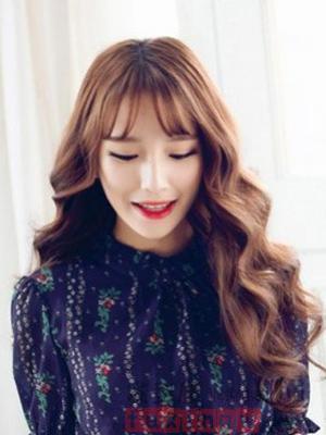 时尚的女生水波纺烫发设计,温暖明亮的棕黄色染发设计,气质吸睛,清新自然的韩国空气感刘海更添灵动感,简单的中长发水波纹烫发更是吸睛。