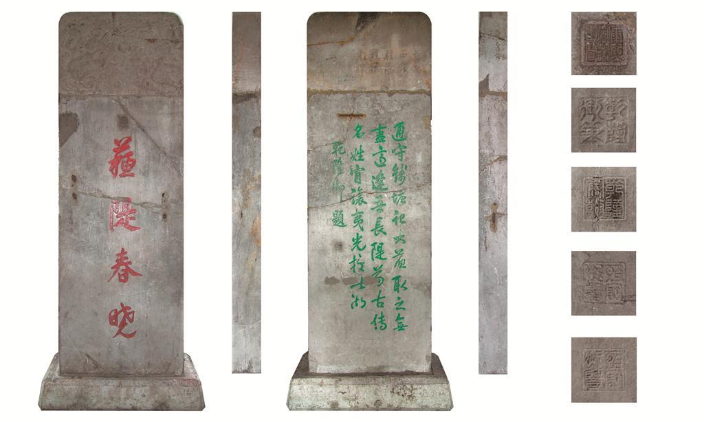 题刻“苏堤春晓”景名的御碑是该景观的重要历史物证之一,是位于苏堤压堤桥以南21米处的堤体西缘,是清康熙三十八年(1699年)康熙帝巡游西湖、品题“西湖十景”、御书“苏堤春晓”景名所立。碑为太湖石所制,通高2.56米,宽1.05米,厚0.22米,碑额正反面浮雕海水和云龙图案,碑身正面刻康熙帝1699年御题行书“苏堤春晓”四字,背面刻乾隆帝1751年御题七言绝句,侧面刻乾隆帝1757年、1762年两次为该景观御题的两首叠韵诗,碑座方形。