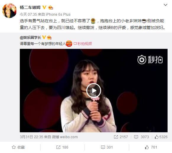 更热闹的是,柯以敏的行为让她十年前的死对头杨二车娜姆也跳了出来。杨二车娜姆今天在微博转发选手被虐视频,并称:“继续撒泼,继续装B的评委,感觉象城管加泼妇。”