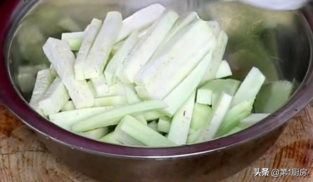 ②.把切好的茄子条放入盆内,加多一点盐抓匀庵制十分钟,十分钟后清水冲洗挤干水分。