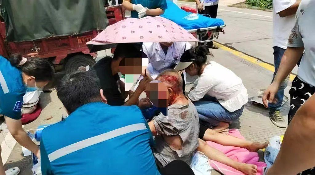 车祸现场触目惊心,一辆三轮车被大货车撞倒后侧翻,车上三人被甩至一高坡下。三人全身多处挫伤并头面部流血不止,其中一人胸部被撞伤,呼吸困难,情况十分危急。医护人员询问病史做完体查后,立即实施现场急救,给患者输氧、止血包扎,固定制动,同时建立静脉通道并搬运至担架上。由于山坡陡峭、天气酷热,给施救增加了不少的困难,120急救团队费了九牛二虎之力,终于将三名伤者从山坡下全部转运至救护车上,并争分夺秒赶回医院,医院已做好接诊准备并开通创伤绿色通道。到院后立即进入创伤中心救治,全部入住神经外科。