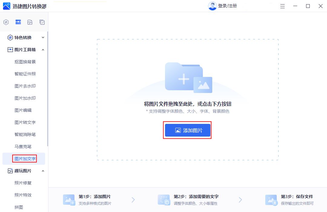 步骤一:打开软件,在【图片工具箱】的模块中找到【图片加文字】功能,点击【添加图片】导入需要处理的图片。